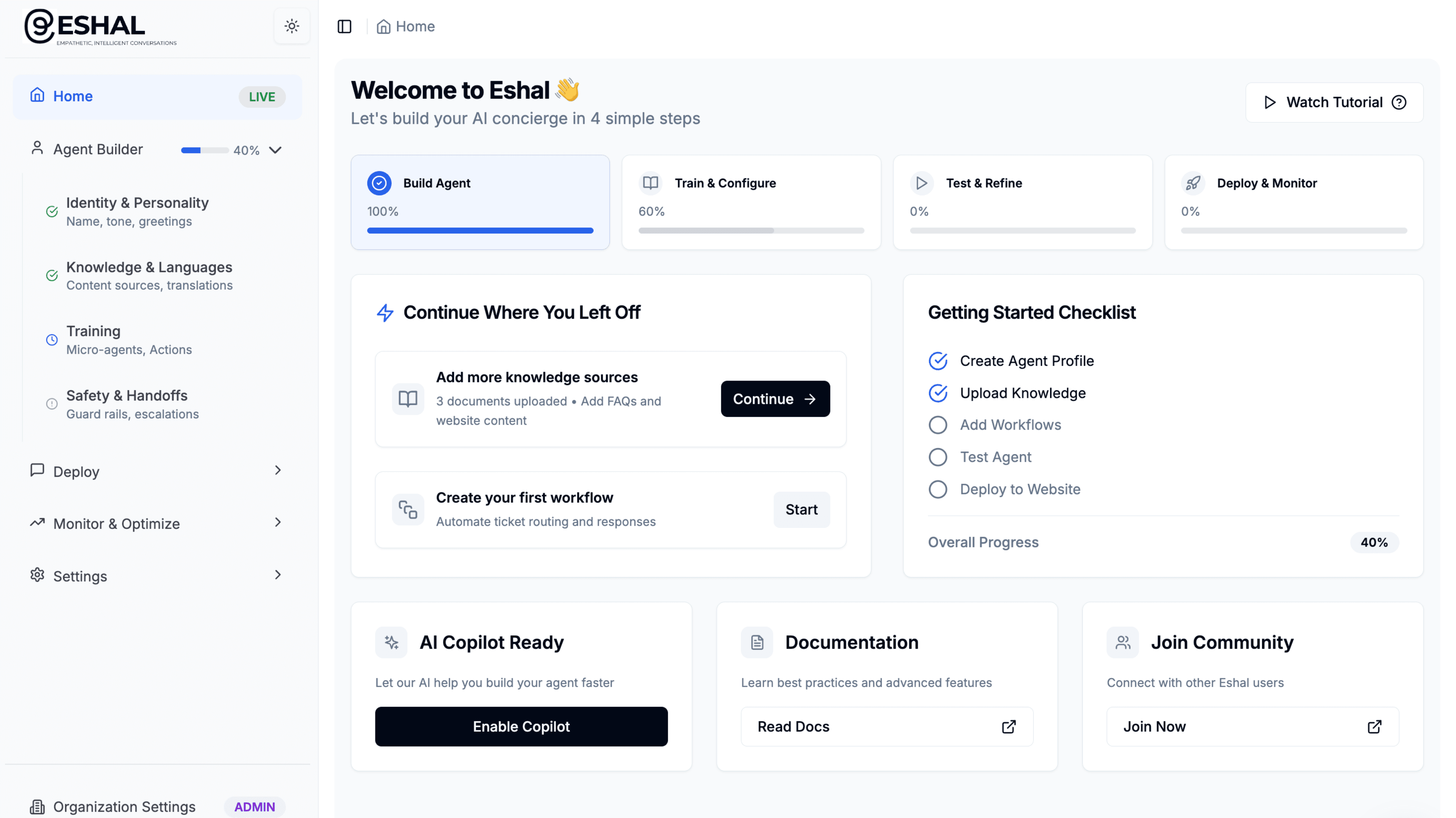 Upload knowledge base, connect systems, and test to ensure everything works as expected.